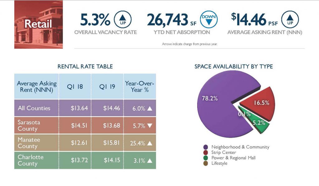 The tri-county area commercial market began the year trending positive with strong market fundamentals for all property types. Looking back at the quarter, one of the largest commercial sales in the market involved a downtown Sarasota retail property. New York Life Real Estate Investors acquired The Shoppes at Sarasota Row, a 59,341-square foot fully leased shopping center, for $24.6 million. The 3.9-acre property is anchored by Whole Foods and includes the only Starbucks in downtown. As we move into the second quarter of 2019, the continued expansion of the area driven by the steady population growth will see an influx of new hotels, retail stores and condominiums materialize. Read on for more of the latest in the region’s commercial real estate market and reach out to one of our highly-qualified commercial agents to learn more about your local market.