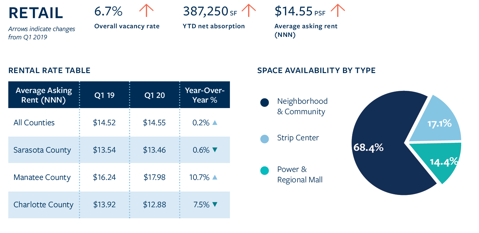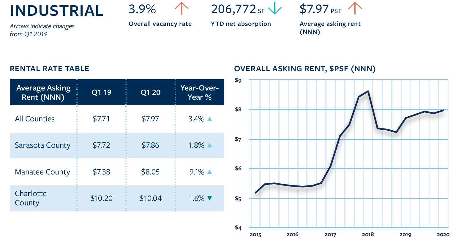 Related News: Land The median price per square foot/acre of sold parcels for Commercial, Industrial, and Residential zoned land from the past four quarters are below: Commercial Land: $6.22 Per Land SF / $271,076 Per Acre Industrial Land: $2.50 Per Land SF / $108,824 Per Acre Residential Land: $1.99 Per Land SF / $86,617 Per Acre Multi-Family The tri-county area remains in the midst of a supply boom. Over 6,000 units have been delivered over the past five years. 2,500+ units are currently under construction. Occupancy Rate: 91.7% YTD Net Absorption: 1,680 Units Average Effective Rent Per Unit: $1,255 Economy The labor force in the tri-county area continued to grow by adding 10,000 jobs over the year. | Economic Indicators | Q4 2018 | Q4 2019 |